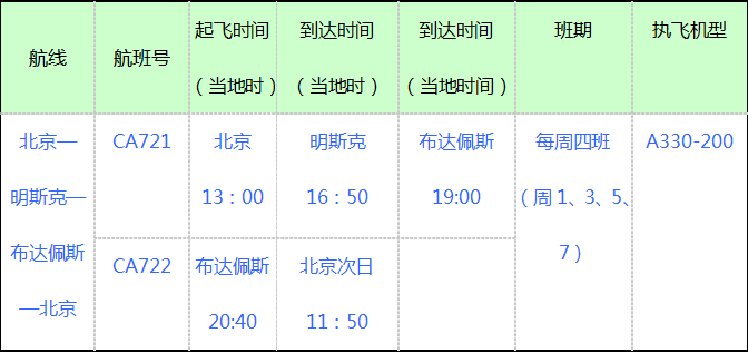 2015年4月30日,国航北京-明斯克-布达佩斯-北京航线开航发布会在北京举行。匈牙利驻中国使馆、白俄罗斯驻中国使馆相关负责人应邀出席了此次活动。由国航一线员工组成的中国国航合唱团现场演绎了中国及东欧民歌,表达了对这条航线开通的美好祝愿。